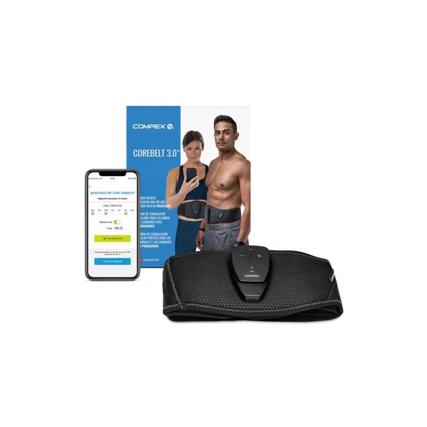 La ceinture de stimulation Compex Corebelt est un appareil de stimulation musculaire contrôlé par une application qui vous aide à renforcer vos muscles abdominaux et dorsaux, à resserrer votre taille et à soulager les maux de dos. En seulement 20 minutes, 3 fois par semaine, le Compex Corebelt peut vous aider à obtenir la silhouette que vous souhaitez (en complément d’une alimentation équilibrée et d’une pratique sportive adéquate). Le coaching intégré à l’application Compex vous permet de suivre vos progrès pour vous motiver à atteindre vos objectifs et tirer le meilleur parti de chaque séance d’entraînement. La gamme Compex CoreBelt se compose de trois ceintures de stimulation musculaire de haute qualité avec lesquelles vous pouvez vous entraîner quand et où vous le souhaitez : Corbelt 1.0, Corebelt 3.0 et Corbelt 5.0, qui diffèrent principalement par les programmes / possibilités d’entraînement et par la conception.